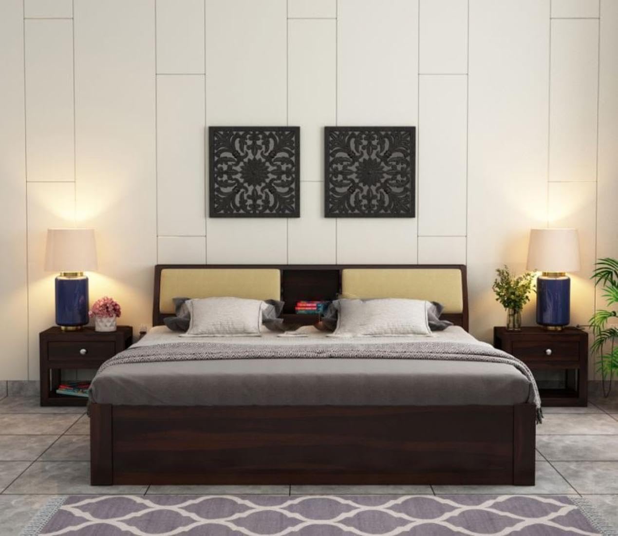 Elevate your bedroom with the stylish and functional Sheesham Queen Storage Bed from Ambica Woodmart. Expertly crafted from premium Sheesham wood, this bed promises lasting durability and showcases the beautiful, natural grain of the wood. Available in two elegant finishes, Natural Honey and Light Walnut, it adds warmth and sophistication that complements a variety of interior styles — whether modern, traditional, or transitional.